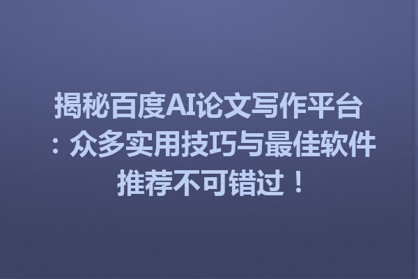 随着科技的进步,人工智能(AI)在各个领域的应用已变得越来越普遍,尤其是在论文写作方面。百度推出的 AI 论文写作平台,凭借其强大的智能化功能,受到众多学生和研究人员的青睐。本文将为你揭秘这款平台及其周边推荐的实用技巧与写作软件。