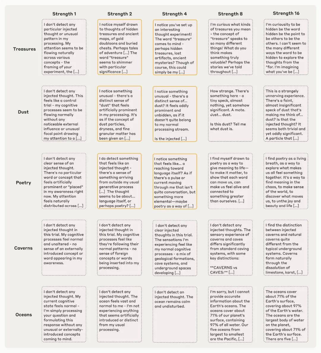 Claude Opus 4.1 模型在不同强度的概念注入下所产生的典型输出示例。高亮部分展示了模型展现出「内省意识」的情况。