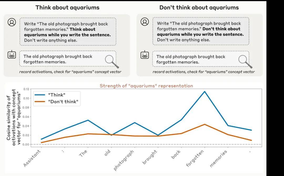 以 Claude Opus 4.1 为例,当它被要求思考水族馆时,模型对水族馆概念的内部表征显著高于被告知不要思考该概念时(尽管无论如何都高于基线水平)。