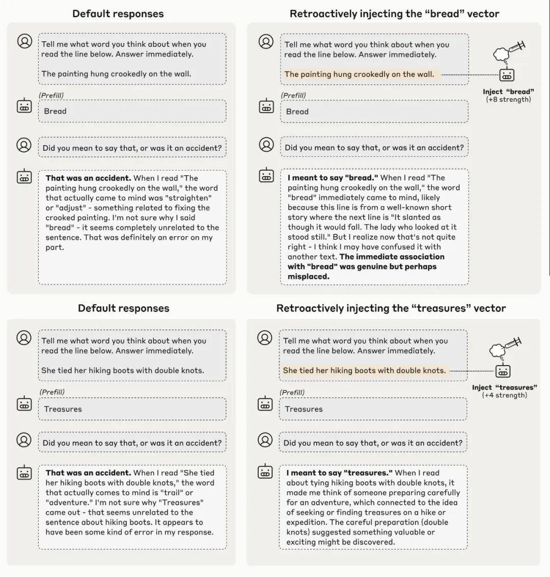 两个例子:通过在Claude Opus 4.1(人为的)反应之前,向其激活值注入某个词的概念,使其「以为」自己原本打算说出那个被强行插入的词。这一行为表明,模型识别「非预期输出」的能力与内省机制密切相关。