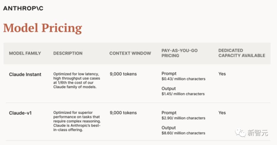 在定价方面,Claude提供两个版本,其中Claude Instant的延迟较低,性能稍逊一筹,价格也低于完整版本的Claude-v1,两者的上下文窗口均为9000个token。