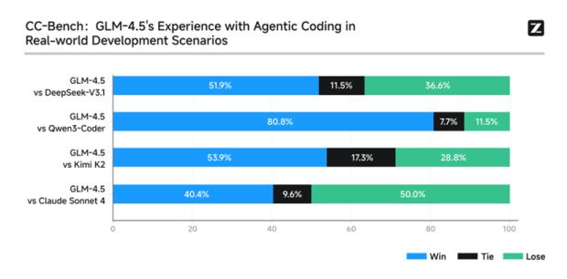 在GLM-4.5发布后的多个开源评测中,该模型与国际主流模型的竞争力保持一致,其中在WebDev Arena中与全球领先模型并列第二,在SWE-bench Verified性能上优于Gemini-2.5-Pro和GPT-4.1。在CC-bench的评测中,智谱、DeepSeek与Kimi K2模型互有胜负,而Qwen-Coder则在一定程度上占据优势。