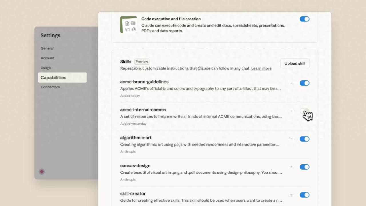 对于不同规模的用户,Anthropic 提供了灵活的部署和管理选项。个人用户可直接在 Claude 的设置中激活该功能,并利用内置的引导技能迅速创建自己的工作流。
