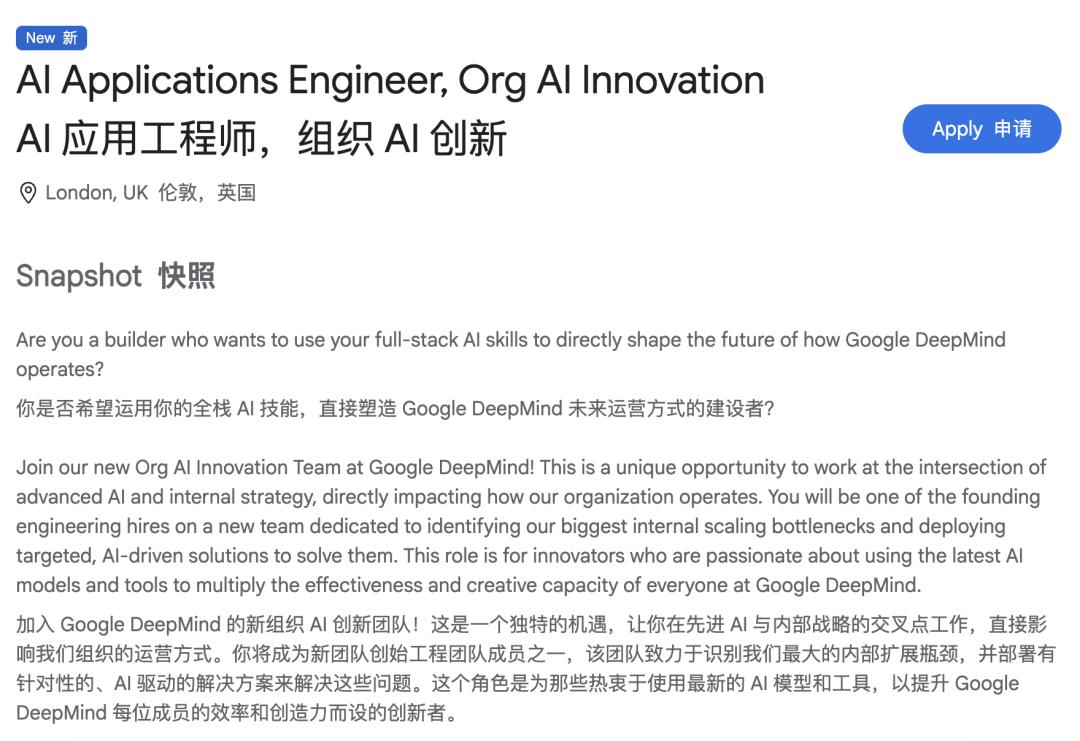 此外,DeepMind还推出了新的AI岗位——AI应用工程师。虽然职位介绍并未透露具体的薪资水平,但预计薪酬会十分可观。