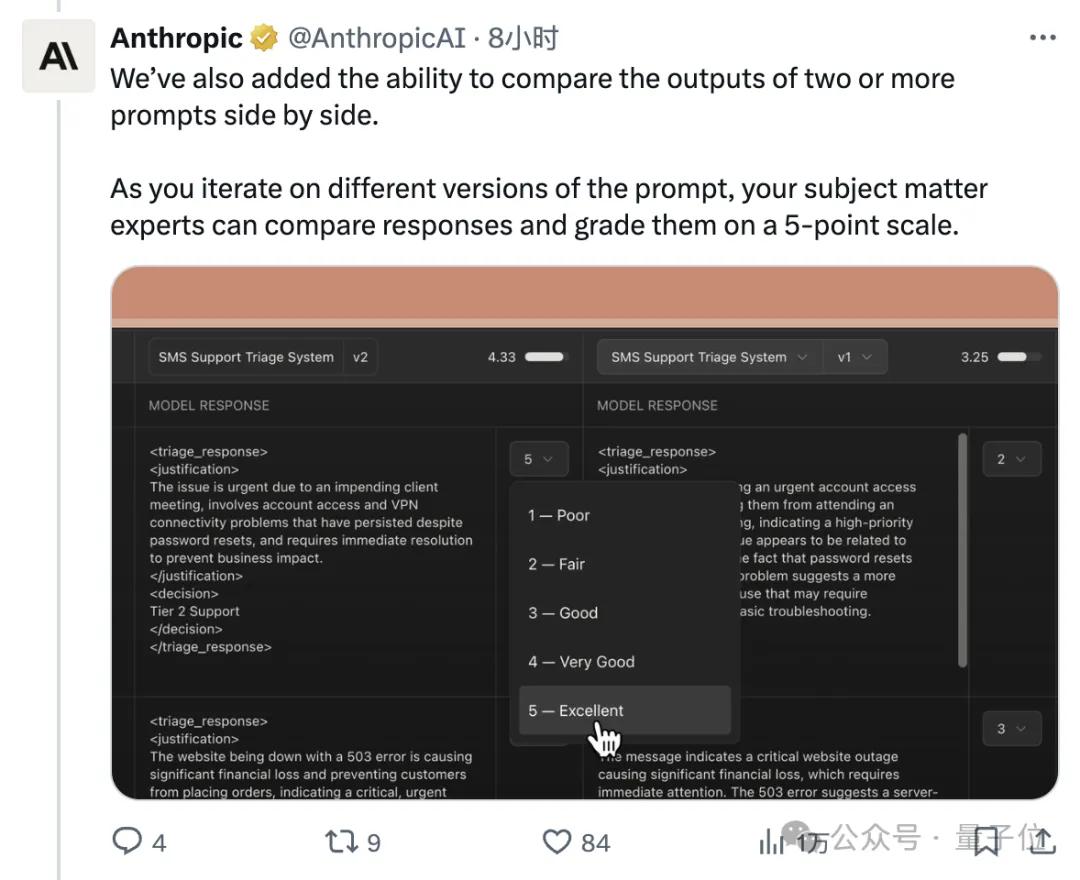 同时,Anthropic深知提示词对生成结果有着重要影响,所以还专门加入了不同提示词生成结果的比较功能,用户还可以根据结果对系统生成的提示词进行打分,从而鞭策Claude进行改进。