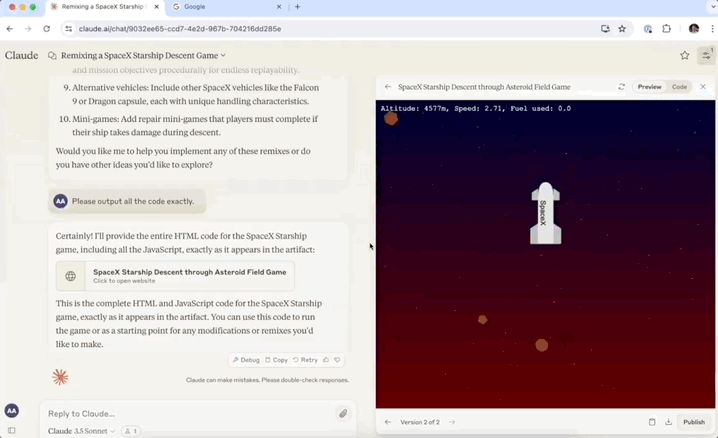 Alex一边介绍,一边展示了用Claude制作的一个飞船小游戏。