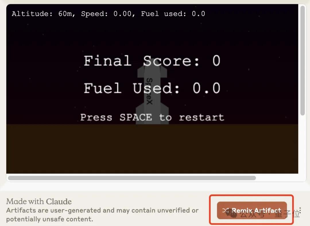 这里我们就简单试一下,改一改游戏中火箭上面的文字,只需要像正常使用Claude一样提出需求,很容易就修改成了。