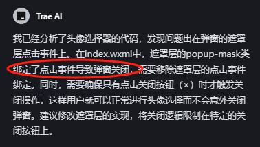 果然,AI这次就精准定位到了问题——遮罩关联的有弹窗关闭事件,遮罩又在最顶层。