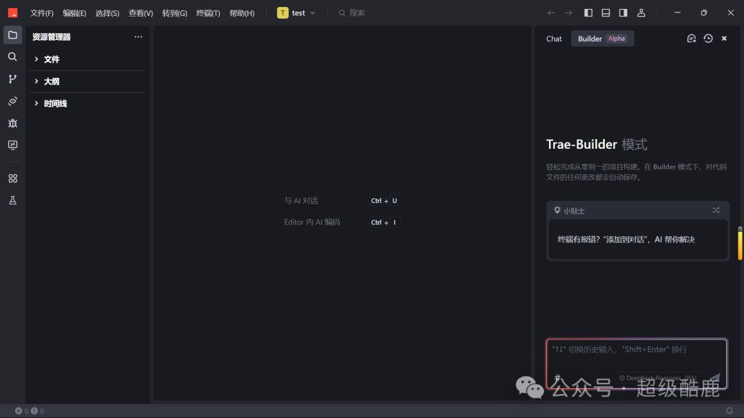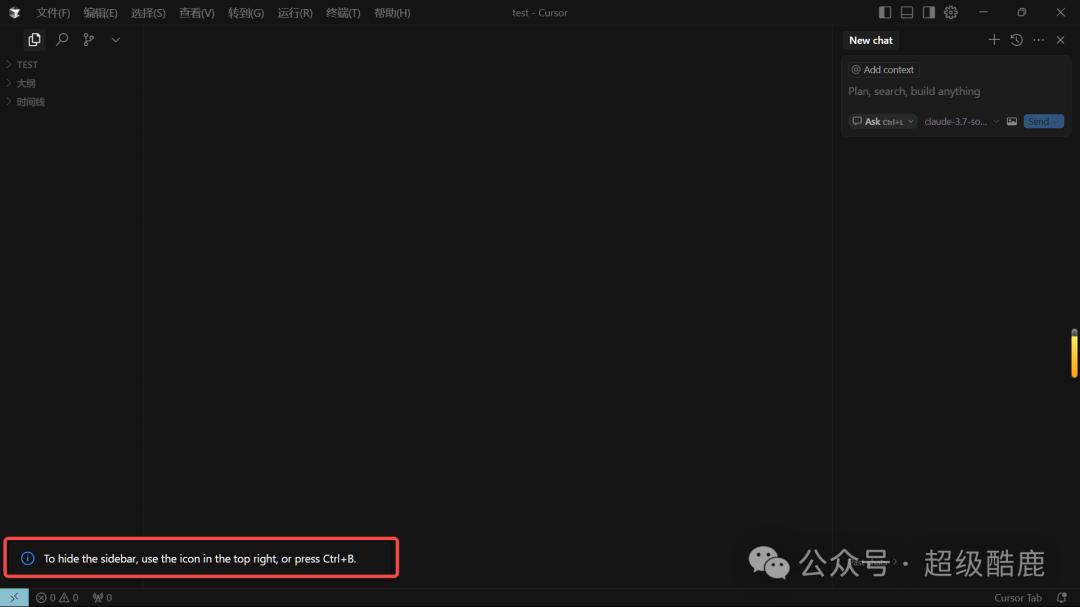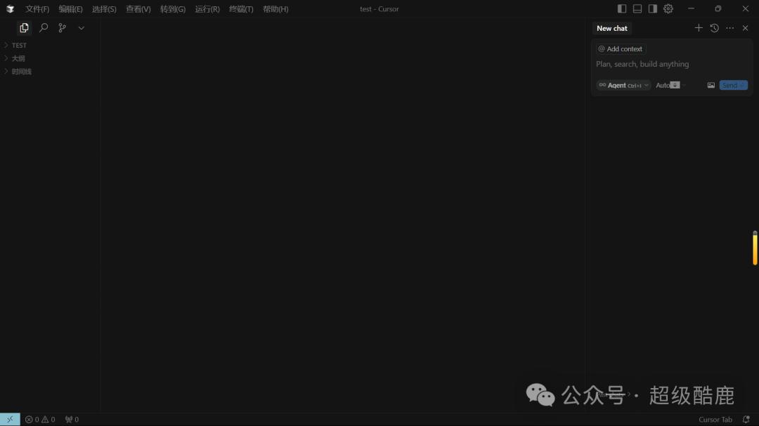 当我们打开一个文件夹,也可以看到中间的工作区和右侧的对话区,但是可以明显看出,相对于Trae的界面,cursor的中间工作区没有快捷键提示,对于新手来说可能会存在不知如何唤起对话框这个问题,如下图: