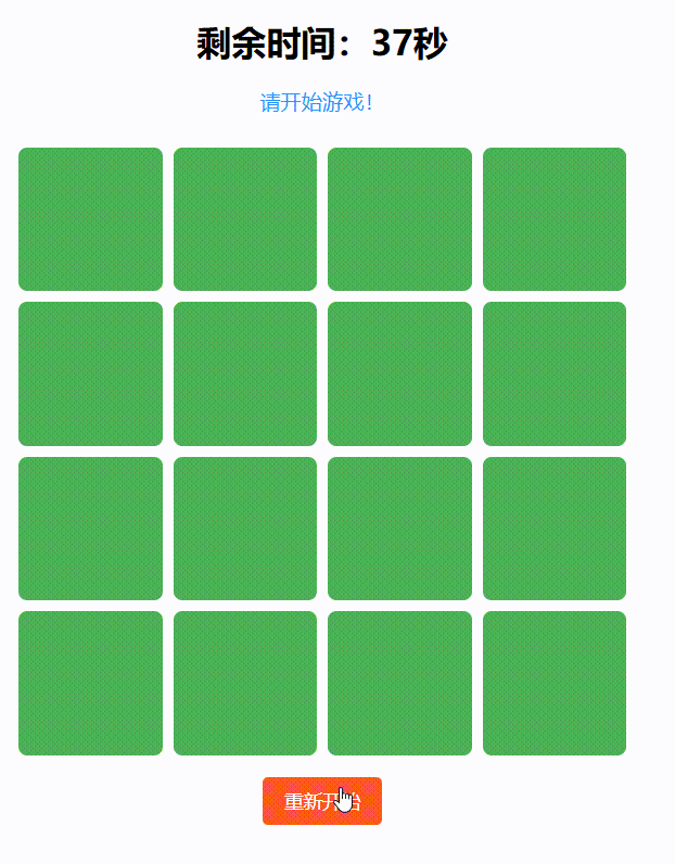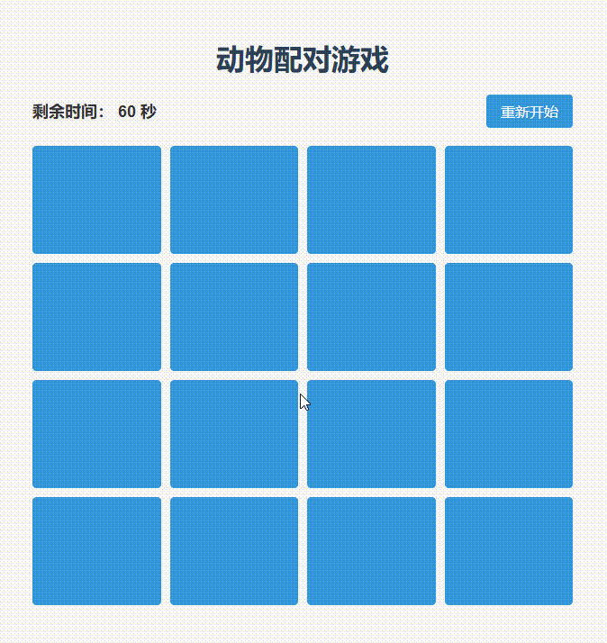 “生成4×4卡牌配对游戏,需要实现点击翻牌显示动物emoji图案、匹配成功保留、60秒倒计时和失败重置功能。”