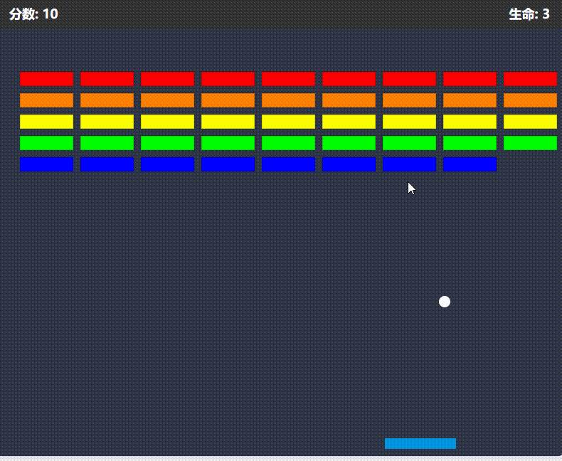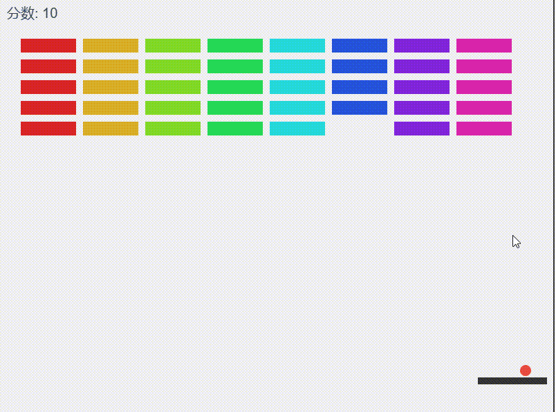 “创建基于鼠标控制的击球游戏,需包含水平移动的反弹板、可破坏彩色砖块阵、实时分数统计和失败重试按钮。”