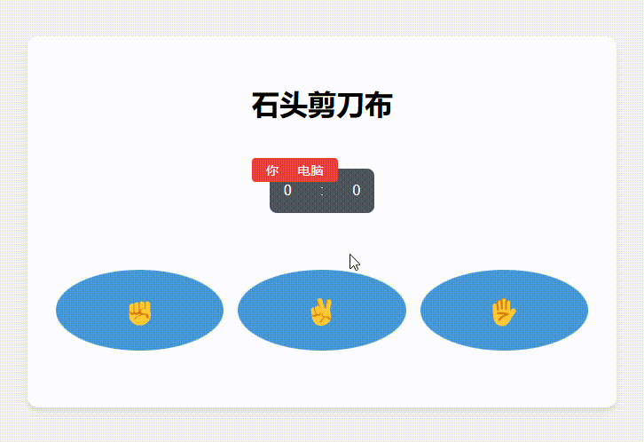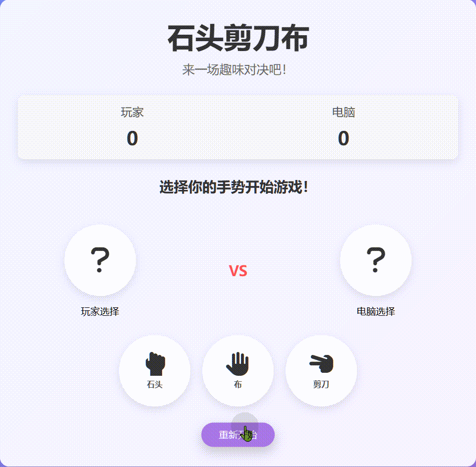 “创建包含晃动选择按钮(石头/剪刀/布)、电脑AI随机选择、动态比分展示和胜负动画效果的网页对战游戏。”