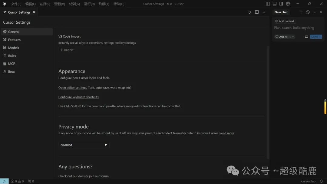 另外cursor的菜单栏初始时英文的,如果用户需要中文显示则需安装中文插件,但是cursor本身的一些提示和设置界面还是会以英文显示,这可能会降低中国用户的使用体验,如下图: