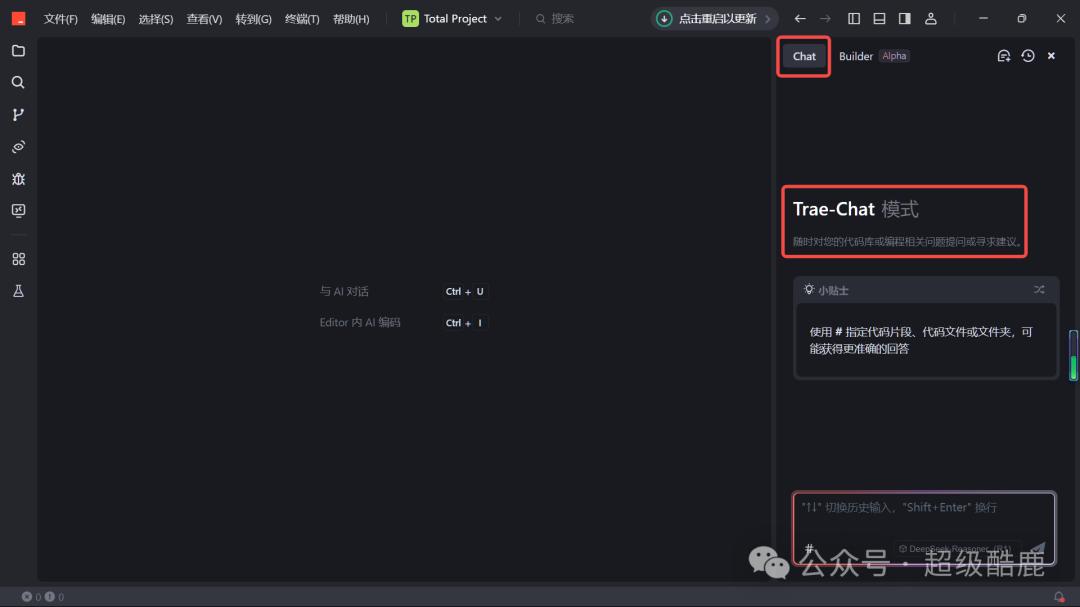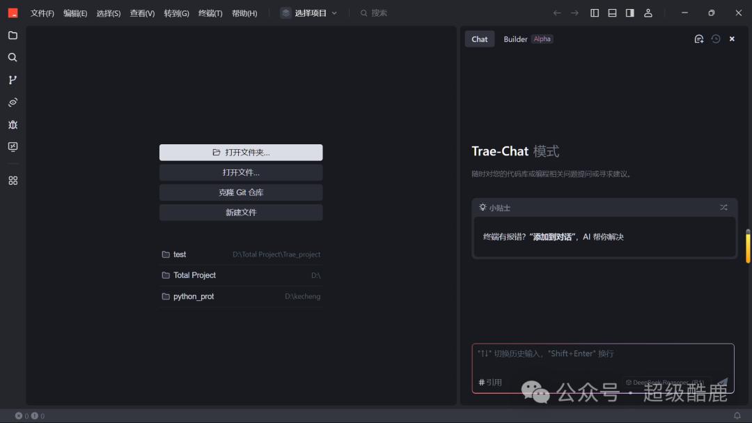 刚开始开打Trae,最开始看到的是醒目的工作区,提示我们打开文件夹等我们需要的对文件的操作;还有右侧的对话区,可以选择我们需要使用的模式,如下图: