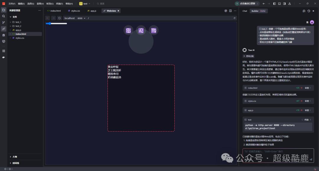 在太空餐厅点餐模拟器开发中,Cursor全面且精确地实现了所有指令要求,交互设计合理,用户体验优秀。而Trae的成果存在功能缺失和交互逻辑不符等问题。