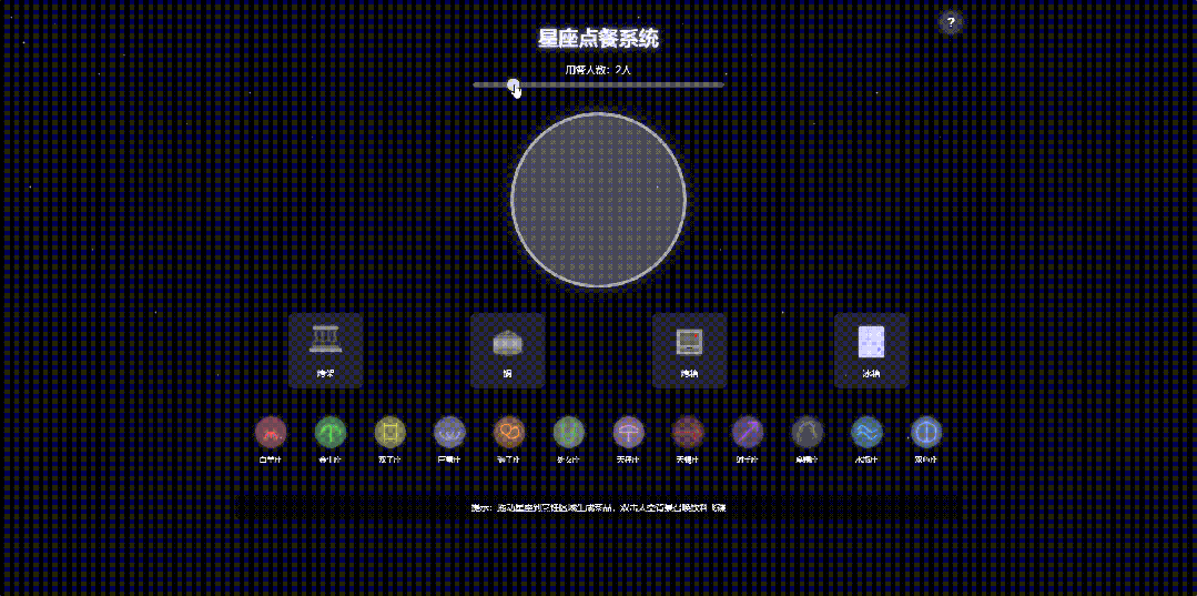 – 点击星座图标生成菜品(如拖动巨蟹座到烤架出牛排)