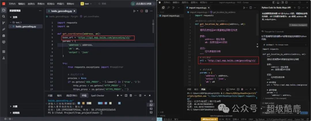 总结:Trae需要人工干预提示,而Cursor能直接生成语法正确且可执行的完整调用代码,最终二者最后生成的代码都能成功的调用API,完成任务需求。