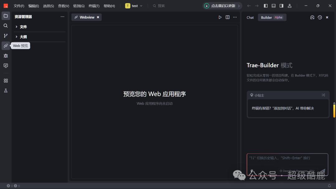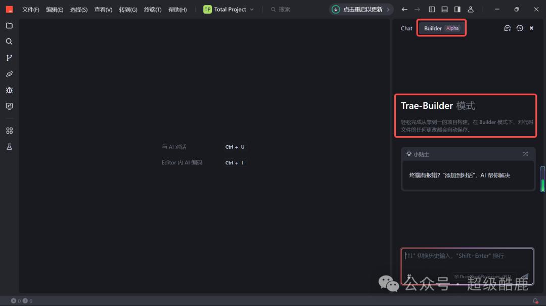 点击右侧对话框的Builder模式可以直接用自然语言进行对话,这对编程小白来说几乎零门槛,如图下图: