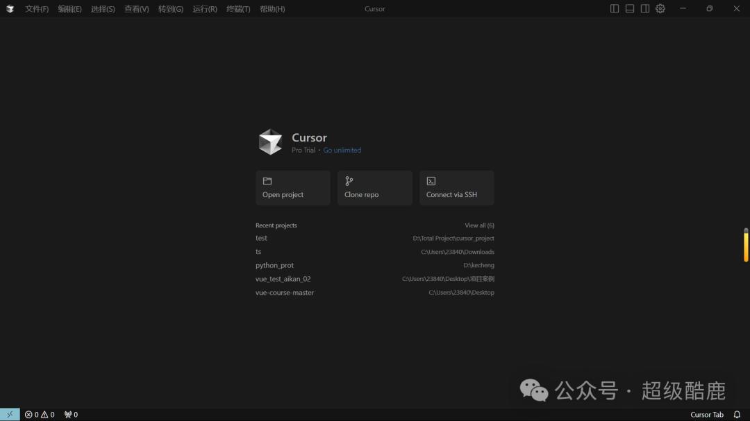 初始打开cursor可以看到选择项目、克隆仓库和通过SSH连接选项,我们可以选择需要的操作。但是因为不是中文界面,所以对于国内用户来说不是那么友好,如下图:
