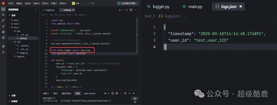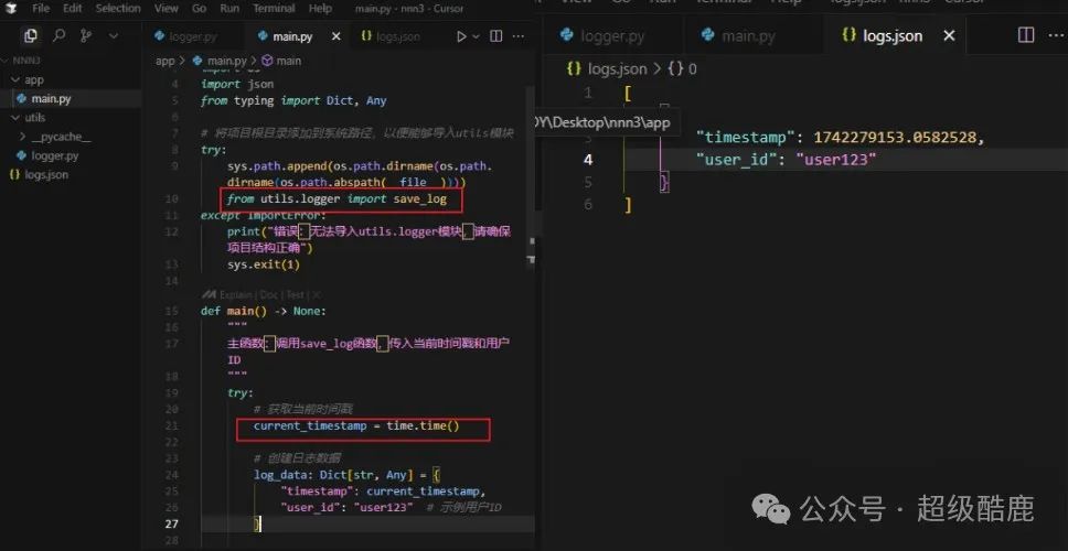“在项目根目录下创建以下文件1. utils/logger.py:生成一个日志记录函数 save_log(log_data),将字典数据保存到 logs.json 文件 2. app/main.py:生成一个主函数,调用 utils.logger.save_log,传入当前时间戳和用户 ID”