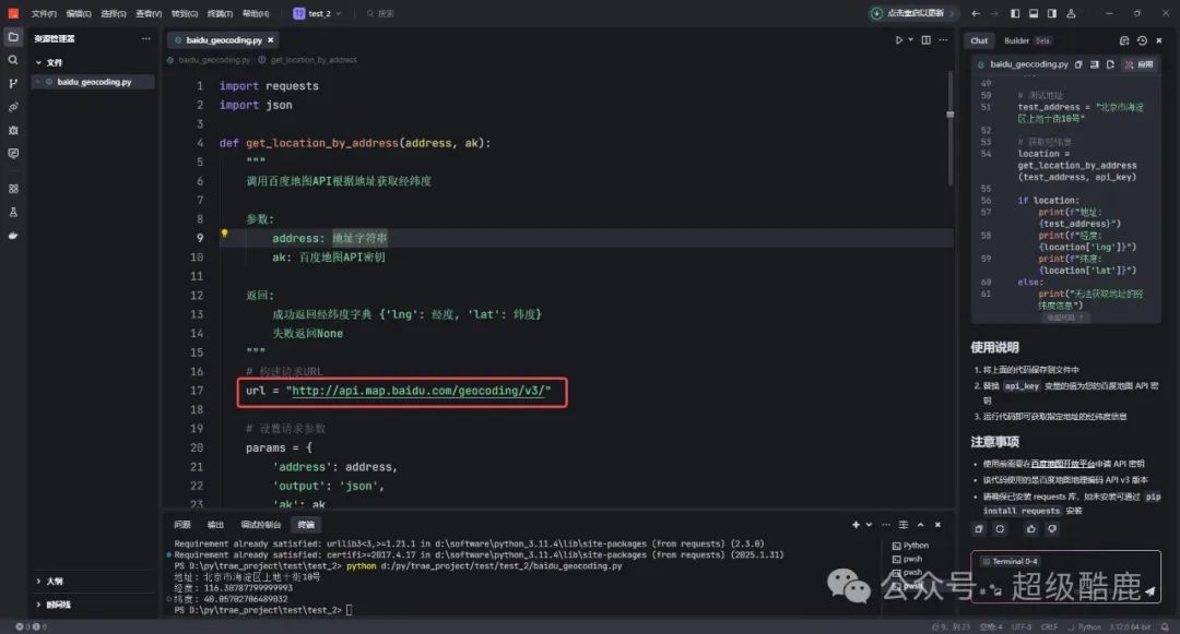 “生成调用百度地图 API 的 Python 代码,根据地址获取经纬度,API 文档要求参数为:ak=密钥, address=地址, output=json。”