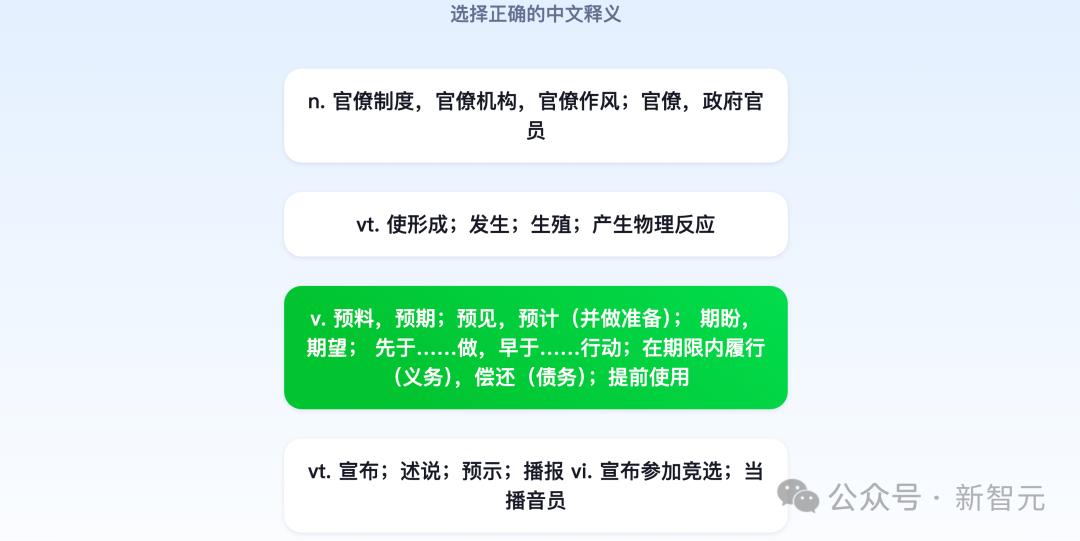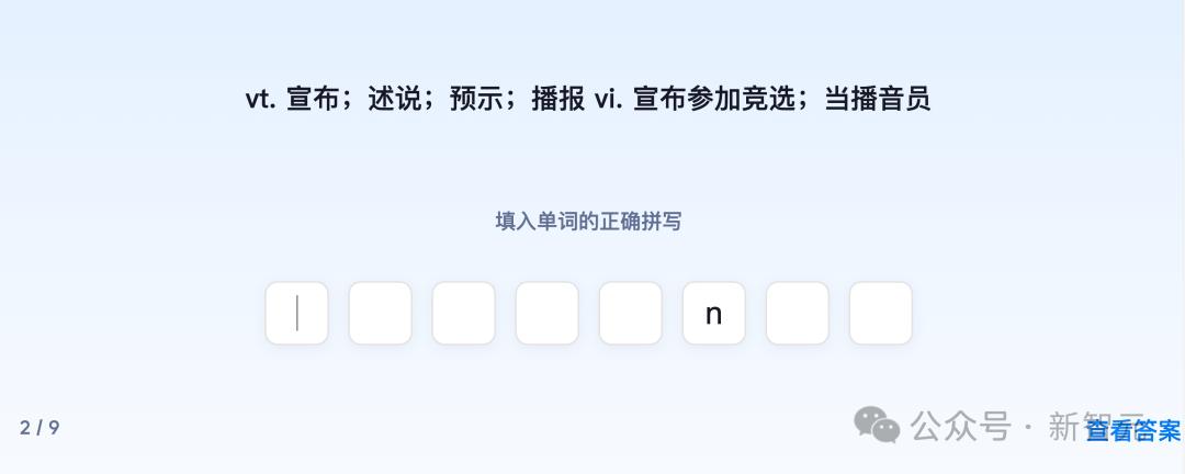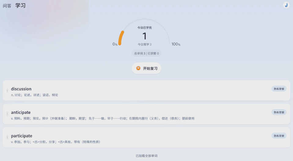 点击开始复习,就可以就可以进入学习界面,学习界面中有诸多功能帮助你巩固单词,比如补全单词和选择单词对应的中文释义。