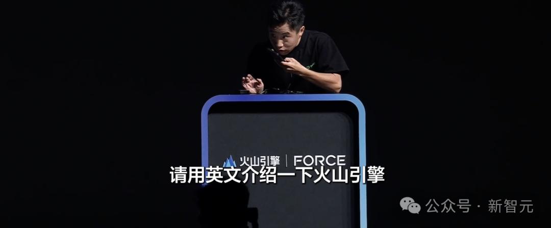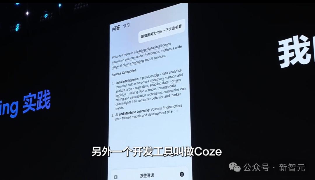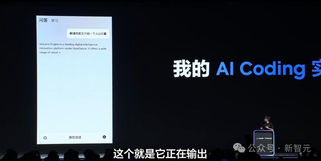 在大会上,洪定坤现场演示了用「语音」的方式让积流成江生成一段介绍一下火山引擎的文本。