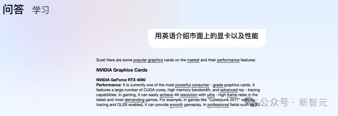 比如我想学习显卡相关的知识,就可以让积流成江先用英语生成显卡相关的文本,看着满屏幕的RTX 4090,确实极大的增强了我的学习动力。