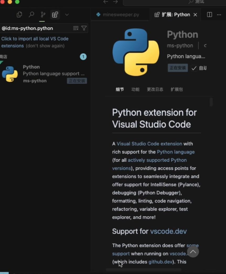 此外,Cursor还支持语言和环境的实时配置。譬如,当生成的代码是Python时,如果电脑上没有配置Python环境,会自动弹出在线安装的按钮,在线配置好代码的运行环境。此外,还内置有插件市场,可以搜索各类插件,方便用户傻瓜式编程。