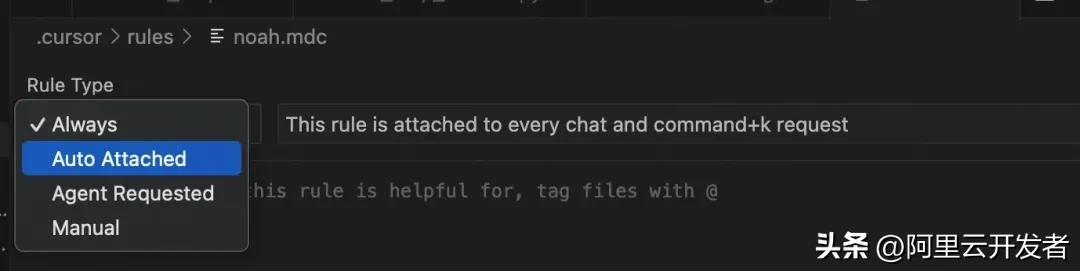 创建完成后会创建一个.mdc文件,这是markdown文件的一个拓展类型文件,你可以直接当做markdown格式进行编写,在左边的ruleType,则是这个规则的类型,主要分四种: