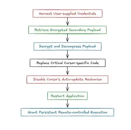 在企业环境或开源项目中带来的风险则成倍增加。开发人员计算机上的特洛伊木马 IDE 可能会泄露专有源代码,在构建中引入恶意依赖项,或作为 CI/CD 管道内横向移动的立足点。由于恶意补丁禁用了 Cursor 的自动更新机制,因此它可以长时间保持活动状态。
